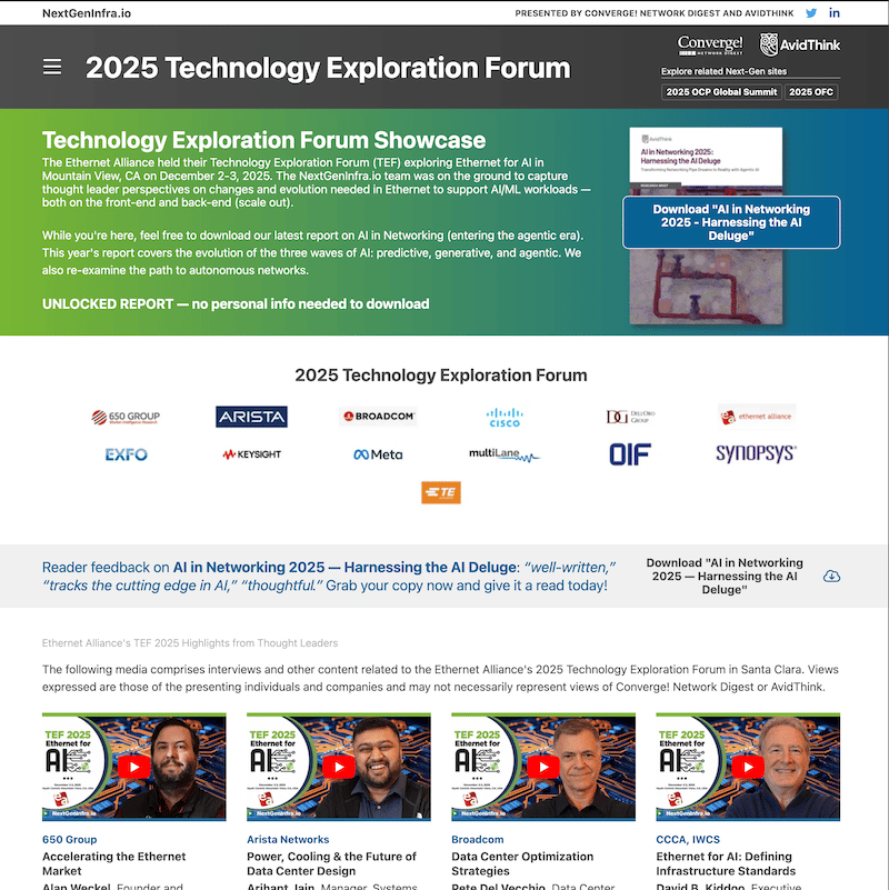 We are working on our data center networking report for release in January 2026, but in the meantime, if you want your fill of AI data center content, UALink, ESUN/SUE-T, Ethernet, GPU connectivity, and more, check out our NextGenInfra.io showcases, including OCP Summit 2025 and the brand new 2025 Technology Ethernet Forum (Ethernet Alliance) showcase. With content from Arista Networks, Broadcom, Cisco, Keysight, and alliance members, as well as leading analysts from 650 Group and Dell’Oro, check it out for the latest insights on the role and future of Ethernet for AI/ML workloads.