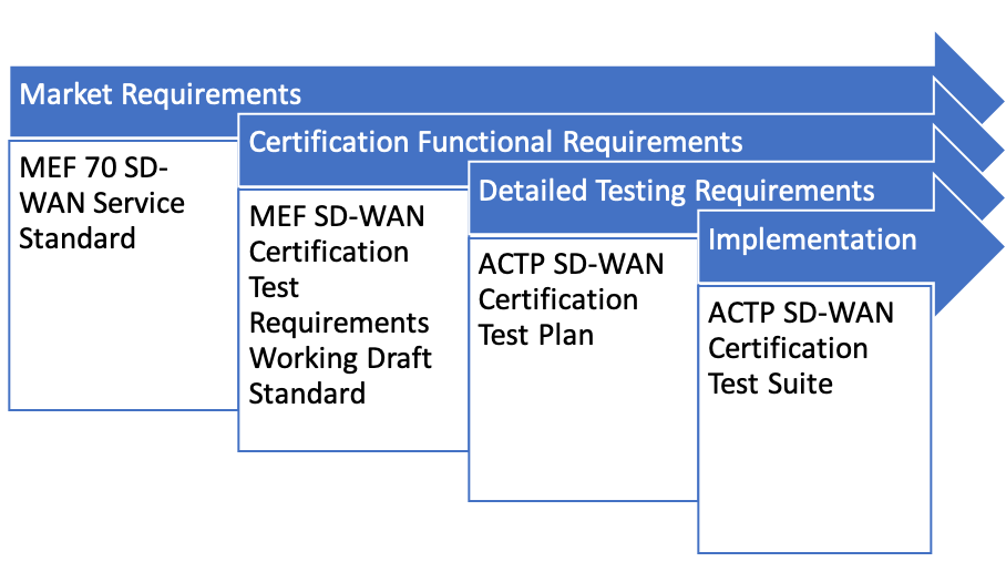 At this initial stage, MEF 70 does not impose performance requirements on the managed services nor on SD-WAN endpoints. However, over time it is expected that performance requirements ― and subsequently certification tests ― will be added to future versions of MEF 70, and hence the chain of certification standards, specifications, and test cases, as depicted in Figure 3.