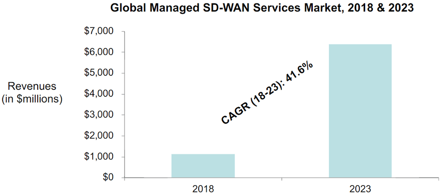 The rapidly growing, yet increasingly fragmented, market for SD-WAN managed services motivated MEF to introduce the industry’s first SD-WAN standard in 2019. Recent market projections revealed over 40% growth, as large and medium enterprises shun the do-it-yourself model for managed services as indicated in Figure 2.