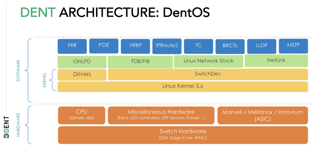 On Wednesday 10/18, I attended the DENT Mini-summit. DENT was initiated as an open source project in 2019 under the Linux Foundation. Charter members included Amazon, EdgeCore, Marvell, and Cumulus Networks, among others. The mission was to develop a stable ethernet switch aimed at enterprise branch offices. The figure below depicts the DENT architecture, a description of the architectural components may be found here. Through the presentations, I learned that SONiC and DENT are two different animals. SONiC has a complex feature set and is typically installed in large data centers, drawing on hardware, software, and support from an ecosystem that includes Arista, Cisco, Juniper, Marvell, Mellanox/NVIDIA, and others. By contrast DENT is relatively simple to implement in edge environments such as branch offices and retail stores.