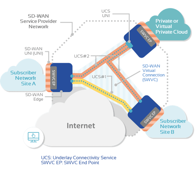 MEF 70 adopts a subscriber/service provider model and specifies the service attributes exchanged over the SD-WAN User-to-Network interface. MEF has defined extensive and precise terminology that collectively forms a common service definition, along with a framework for the service interactions across the overlay as well as the relationship to the underlays.