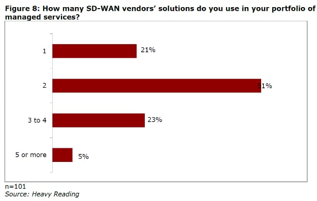 To address the double-digit SD-WAN growth, MSPs have strived to systematically design and deploy new managed SD-WAN services. While MSPs typically qualify one or two primary SD-WAN vendors, enterprise customers are becoming increasingly specific about which products are best suited to their environments. This has increased the number of vendors and products that MSPs are compelled to support (see Figure 1), as well as their carrying costs. Exacerbating this situation is the proprietary nature of the SD-WAN products and MSPs lack of experience with them.